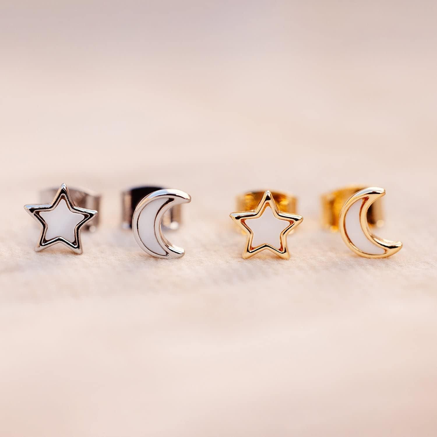Pura Vida Silver/Gold Moon & Star Stud Earrings – Handmade Earrings with White Shell, Boho Earrings – Sterling Silver Earrings for Women, Statement Earrings for Women, Boho Jewelry for Women – 1 Pair(Silver)